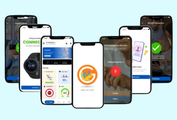 The LongLife Care Watch offers real-time health monitoring, fall detection, SOS emergency alerts, GPS location tracking, and medication reminders. It also syncs with the LongLife Care mobile app for easy monitoring by caregivers.